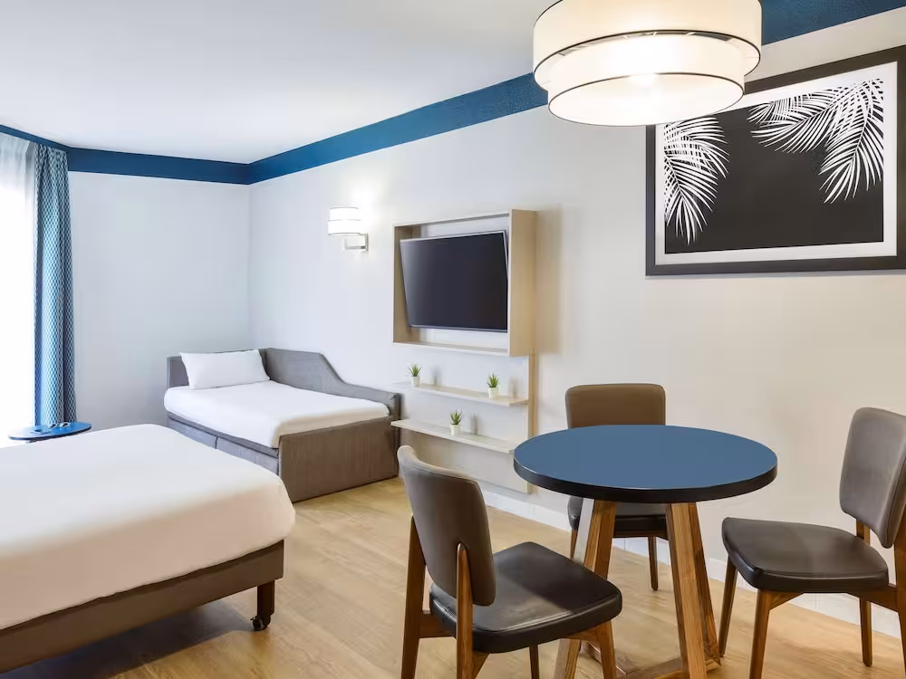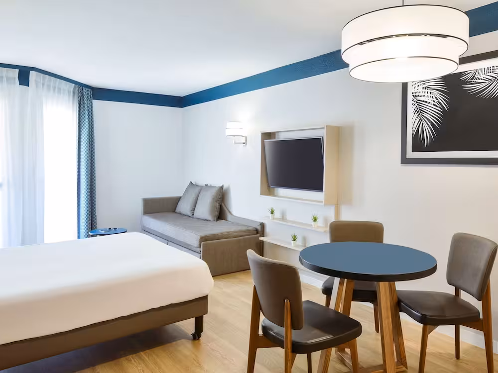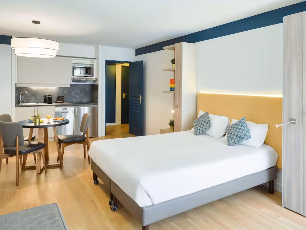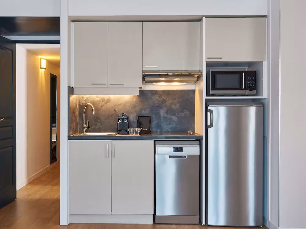 Air conditioning and central heating ensure that rooms maintain comfortable temperatures. The rooms have a double bed and a sofa bed. Extra beds can be requested. A safe provides secure storage for guests' personal property. There is a fully-equipped kitchenette with a refrigerator, stovetop, microwave, tea/coffee station, dishwasher and oven. An ironing set is provided for guests' convenience. A telephone, a TV and WiFi (no extra charge) are provided as well. A shower, a bathtub and a bidet are included the bathrooms. A hairdryer is also provided. For extra comfort in the bathrooms, guests are offered cosmetic products. Guests can also book wheelchair-friendly rooms with wheelchair-accessible bathrooms. The hotel has family rooms, non-smoking rooms and smoking rooms.