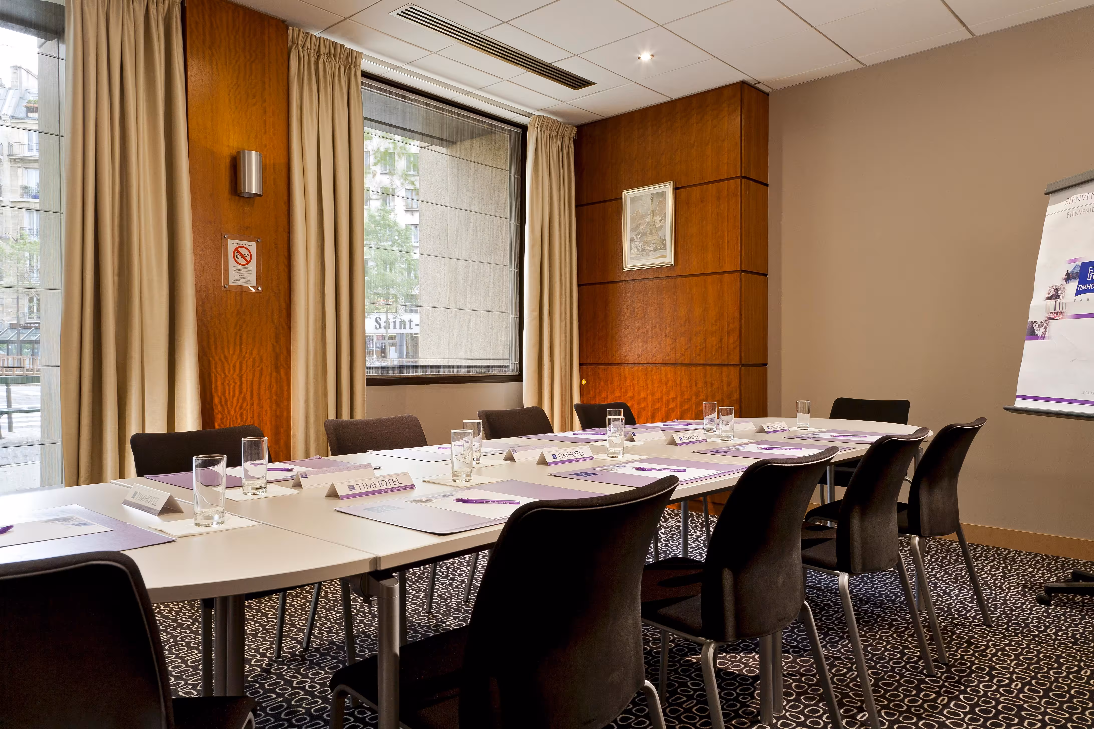 Situated in the 17th arrondissement of Paris, the hotel is very convenient for both business and tourism stays, with a Métro station (number 13) and RER (C) station in front of the hotel which lead directly (no change) to the main points of interest such as the department stores on Boulevard Haussmann, Champs-Élysées and the Tour Eiffel (Champ de Mars).