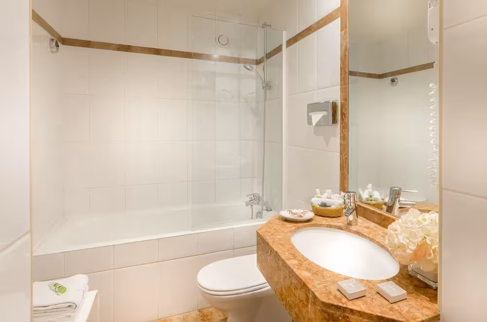 Air conditioning and central heating ensure that rooms maintain comfortable temperatures. The rooms have a double bed and a sofa bed. Extra beds can be requested. A safe and a minibar are also available. A refrigerator, a mini fridge and a tea/coffee station are standard features. An ironing set is provided for guests' convenience. A telephone, a TV and WiFi (no extra charge) are provided as well. Bathrooms are equipped with a shower, a bathtub and a bidet. For additional convenience, bathrooms also provide a hairdryer. Wheelchair-friendly rooms can be booked. The hotel has family rooms, non-smoking rooms and smoking rooms.