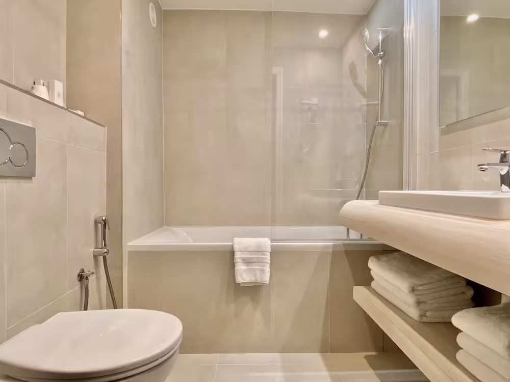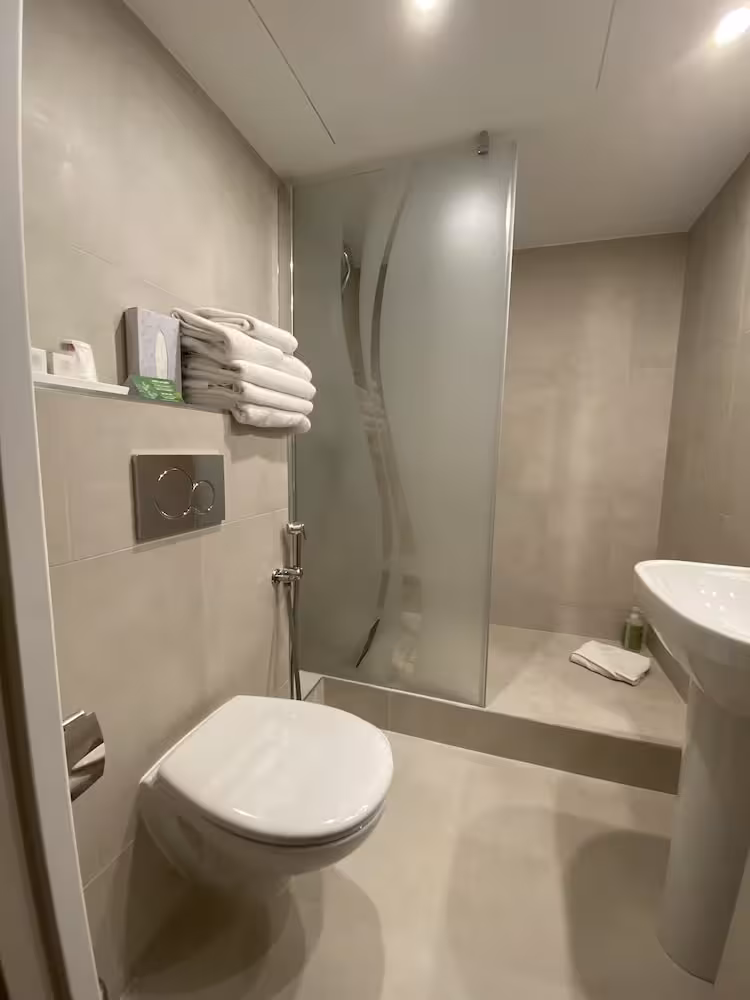 Rooms are equipped with air conditioning, individually adjustable heating and a fan. All rooms are carpeted and include a double bed. Extra beds can be requested. A safe and a desk are also available. Guests will also find a tea/coffee station included among the standard features. An ironing set is provided for guests' convenience. A direct dial telephone, a television with satellite/cable channels and WiFi (no extra charge) are provided as well. Bathrooms are equipped with a shower and a bathtub, as well as a hairdryer. For extra comfort in the bathrooms, guests are offered cosmetic products. Wheelchair-friendly rooms with wheelchair-accessible bathrooms are also available. The hotel has family rooms and non-smoking rooms.