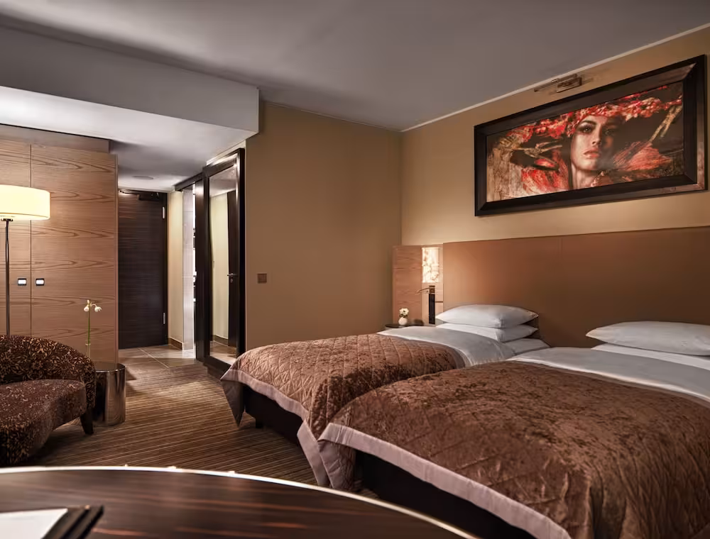 Air conditioning, central heating and a fan ensure that rooms maintain comfortable temperatures. All rooms are carpeted and have a double bed or a king-size bed. Extra beds can be requested. A safe, a minibar and a desk are also available. Additional features include a refrigerator and a tea/coffee station. There is also an ironing set and a trouser press. A telephone, a TV, a radio, a plug adapter, an alarm clock and WiFi provide all the essentials for a comfortable holiday. Guests will also find slippers in their rooms. A shower and a bathtub are included the bathrooms. A hairdryer, a vanity mirror, bathrobes and a telephone are available for daily use. As a special feature, bathrooms are also stocked with cosmetic products and a selection of towels. Guests can also book wheelchair-friendly rooms with wheelchair-accessible bathrooms. The hotel has non-smoking rooms.
