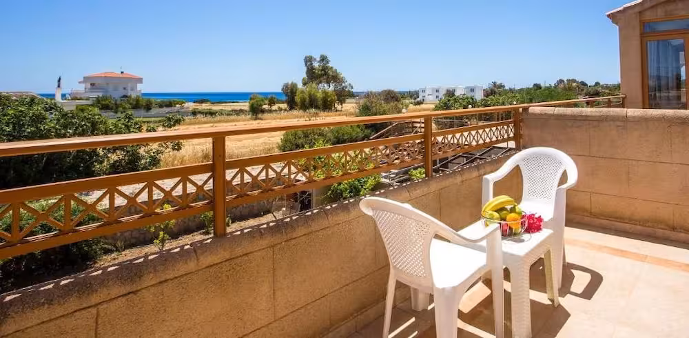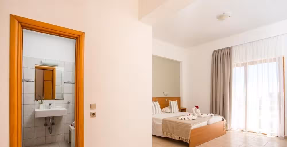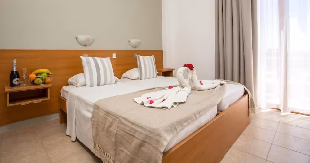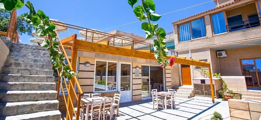 This beach hotel warmly welcomes guests in Gennadi.
