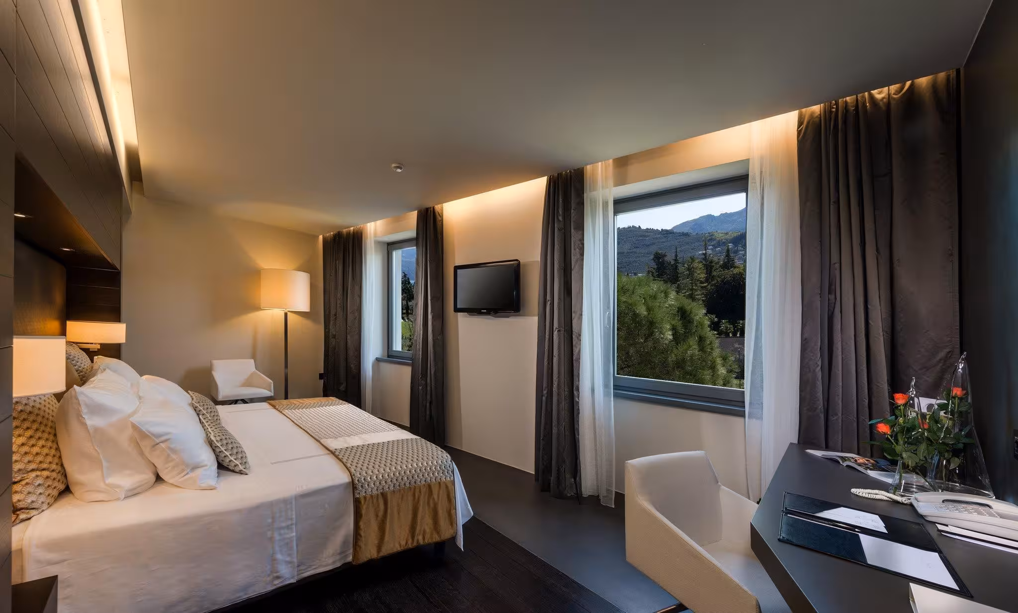 Air conditioning and central heating ensure that rooms maintain comfortable temperatures. Guests can enjoy the lake view from a balcony or terrace. Rooms have a double bed, a queen-size bed or a king-size bed. Separate bedrooms are available. Children's beds and extra beds can be requested for younger guests. A safe, a minibar and a desk are also available. Guests will also find a tea/coffee station included among the standard features. A trouser press is provided for guests' convenience. A telephone, a television with satellite and pay-per-view channels and WiFi are provided as well. Slippers are included. Bathrooms are equipped with a shower and a bathtub. A hairdryer, a vanity mirror, bathrobes and a telephone are available for daily use. As a special feature, bathrooms are also stocked with cosmetic products and a selection of towels. The hotel has family rooms and non-smoking rooms.