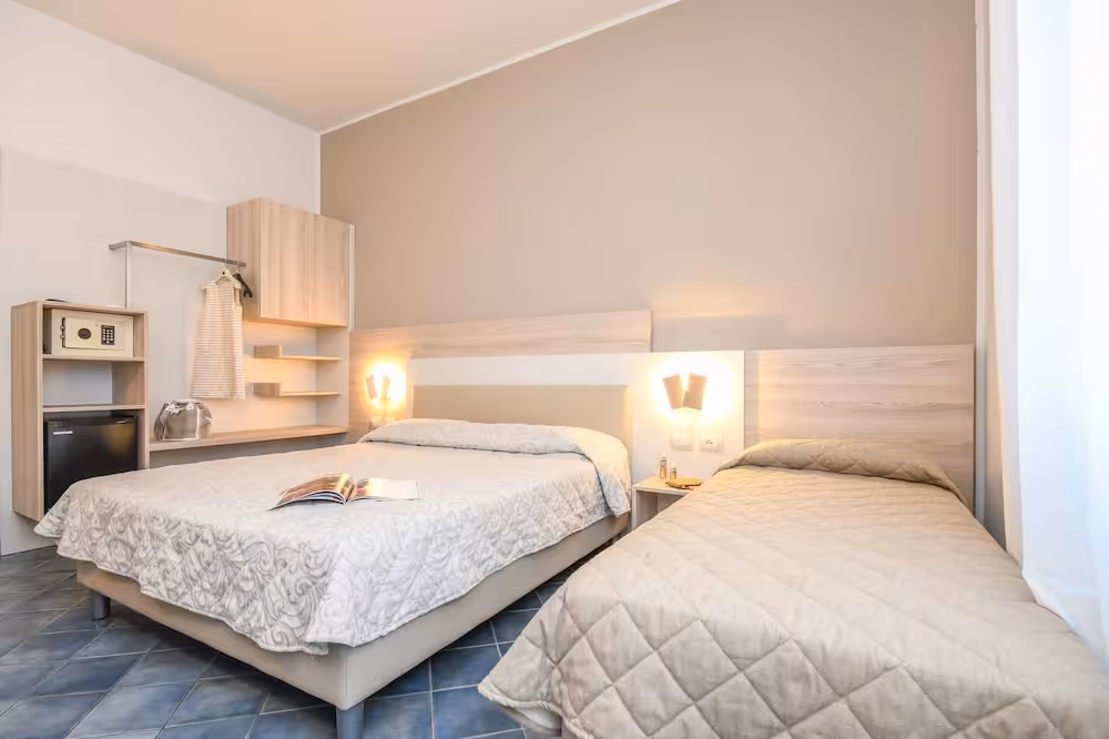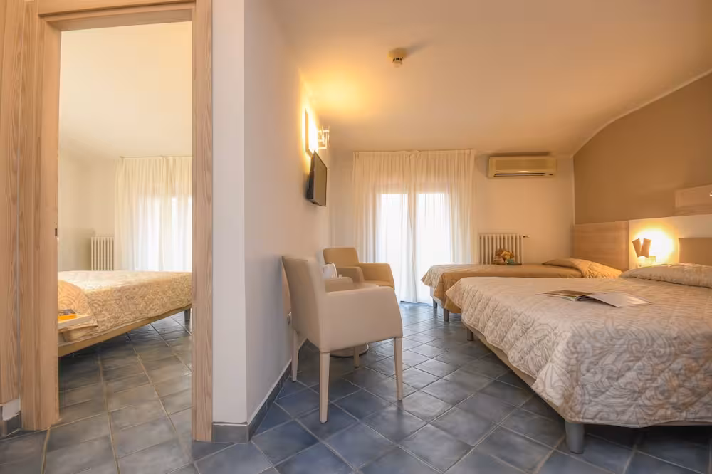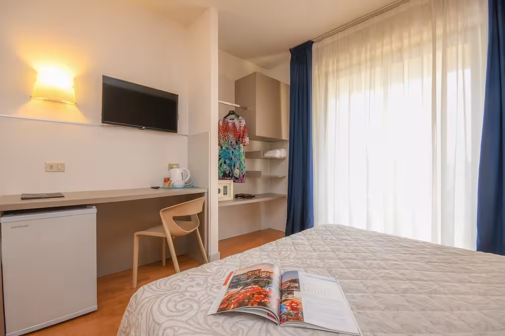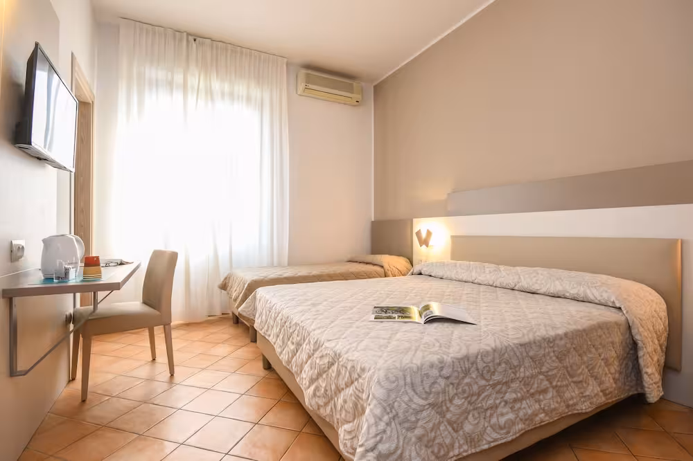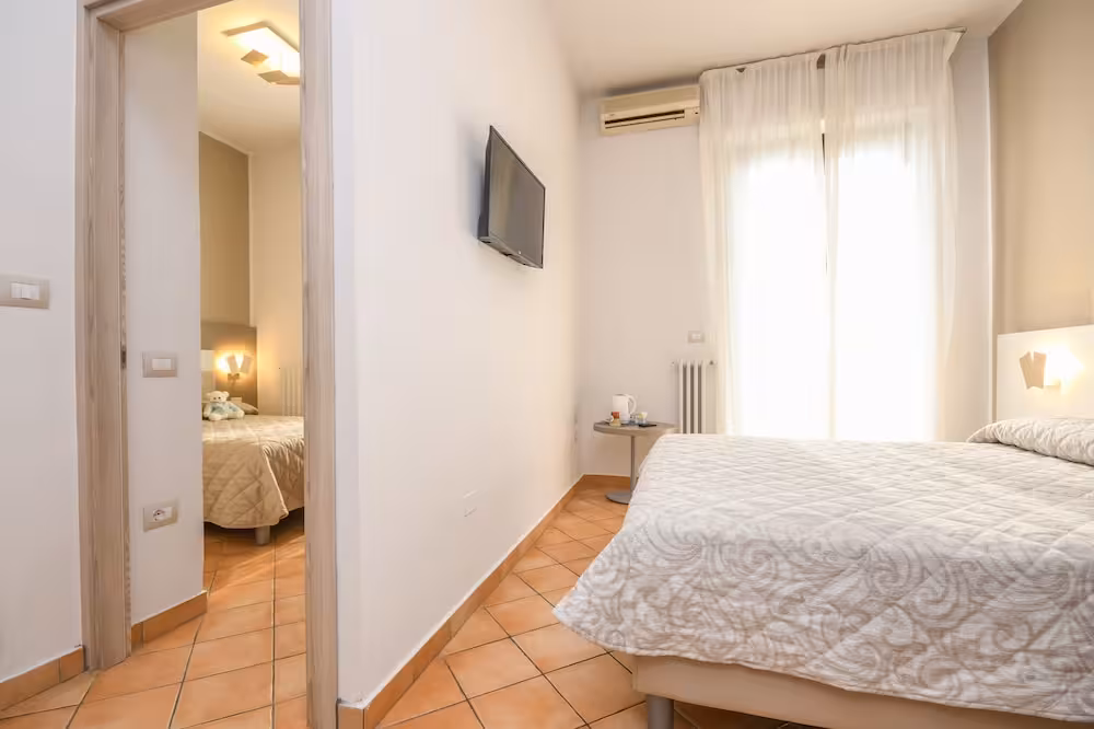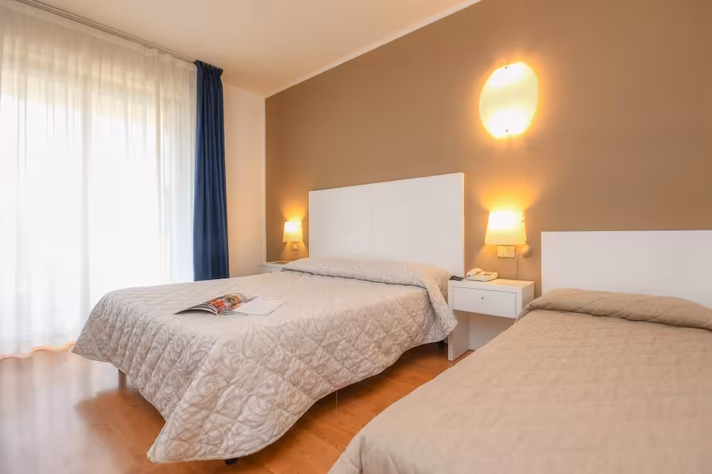 Air conditioning and central heating ensure that rooms maintain comfortable temperatures. A balcony is included as standard in some rooms. All rooms are carpeted and include a double bed. Extra beds can be requested. A safe and a desk are also available. A telephone, a TV and WiFi (no extra charge) provide all the essentials for a comfortable holiday. A shower, a bathtub and a bidet are included the bathrooms. A hairdryer is also provided. As an extra convenience, bathrooms provide cosmetic products. The hotel has family rooms and non-smoking rooms.