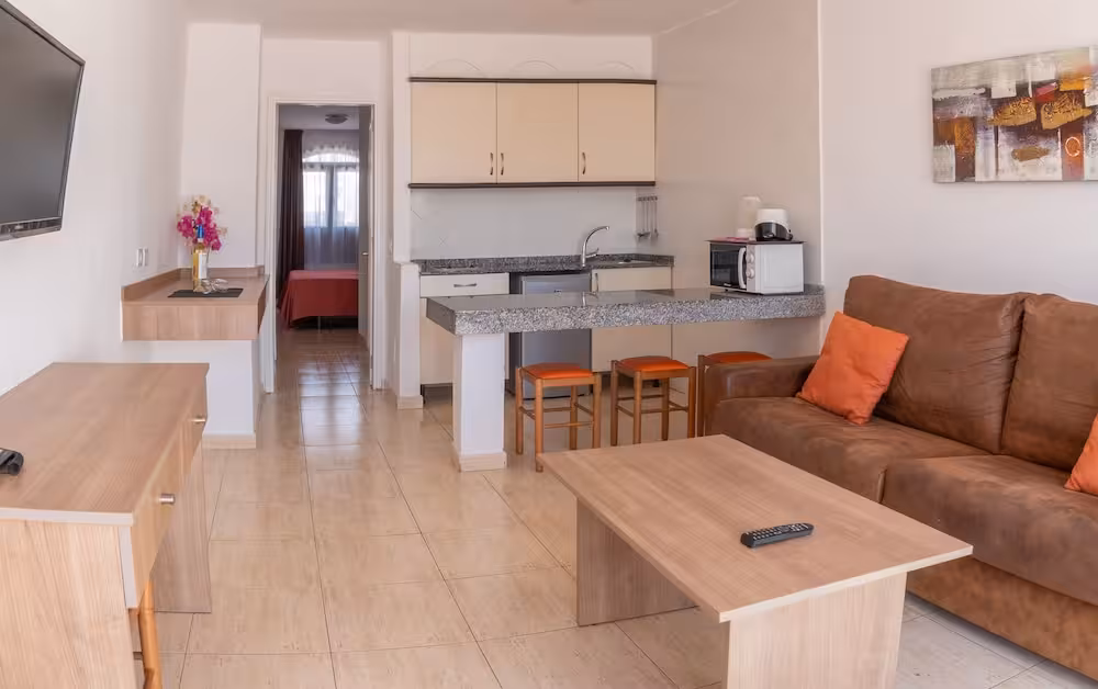 This attractive apartment complex lies on a hillside at the heart of the tourist area of Puerto del Carmen and just 900 metres away from the fine sand beach of Playa Blanca. It is 1 km to the town centre and there are several shopping areas surrounding the complex where guests may explore the different shops, boutiques, bars as well as restaurants (within 600 m). Links to the public transport network are 150 m away.