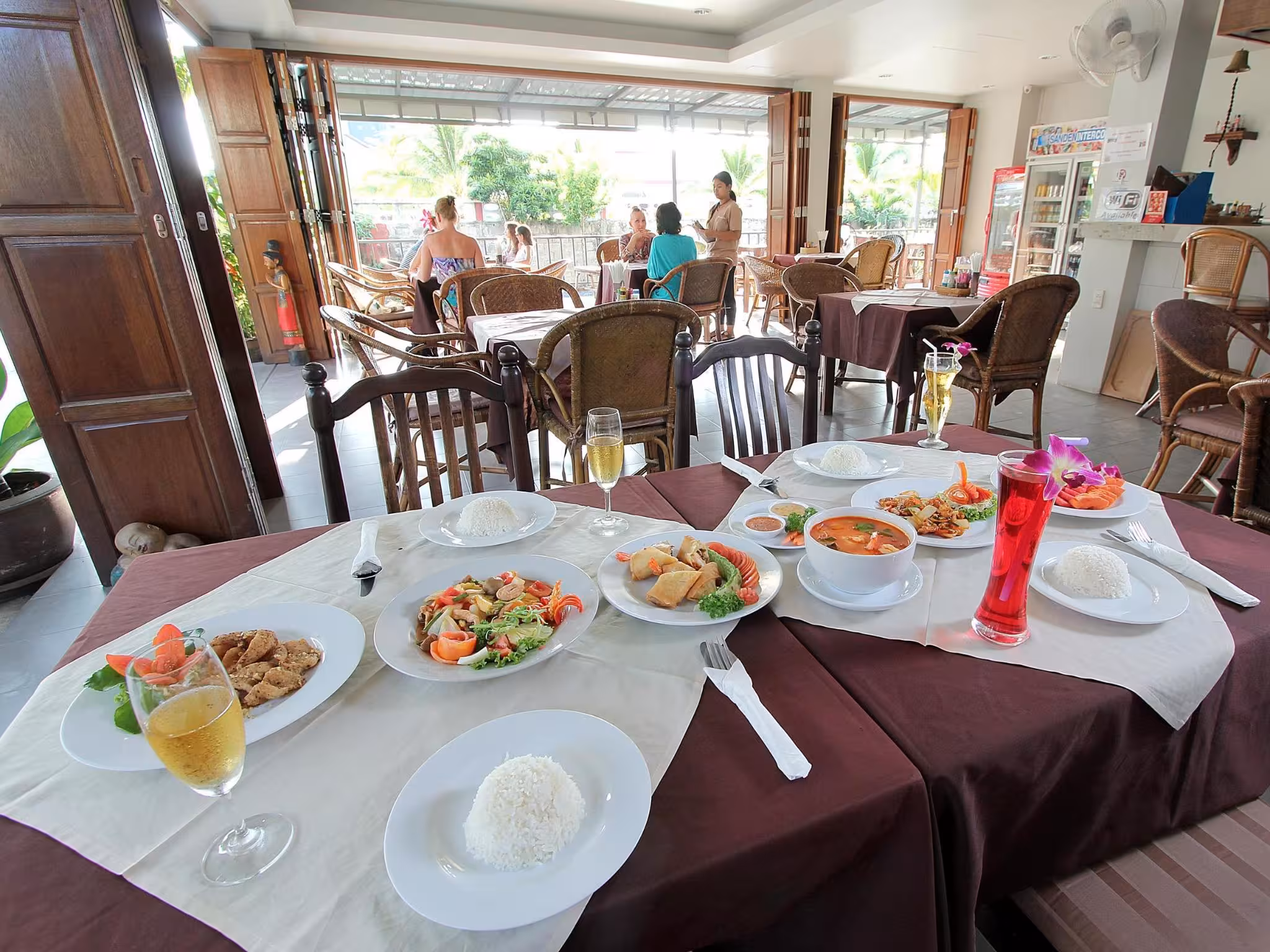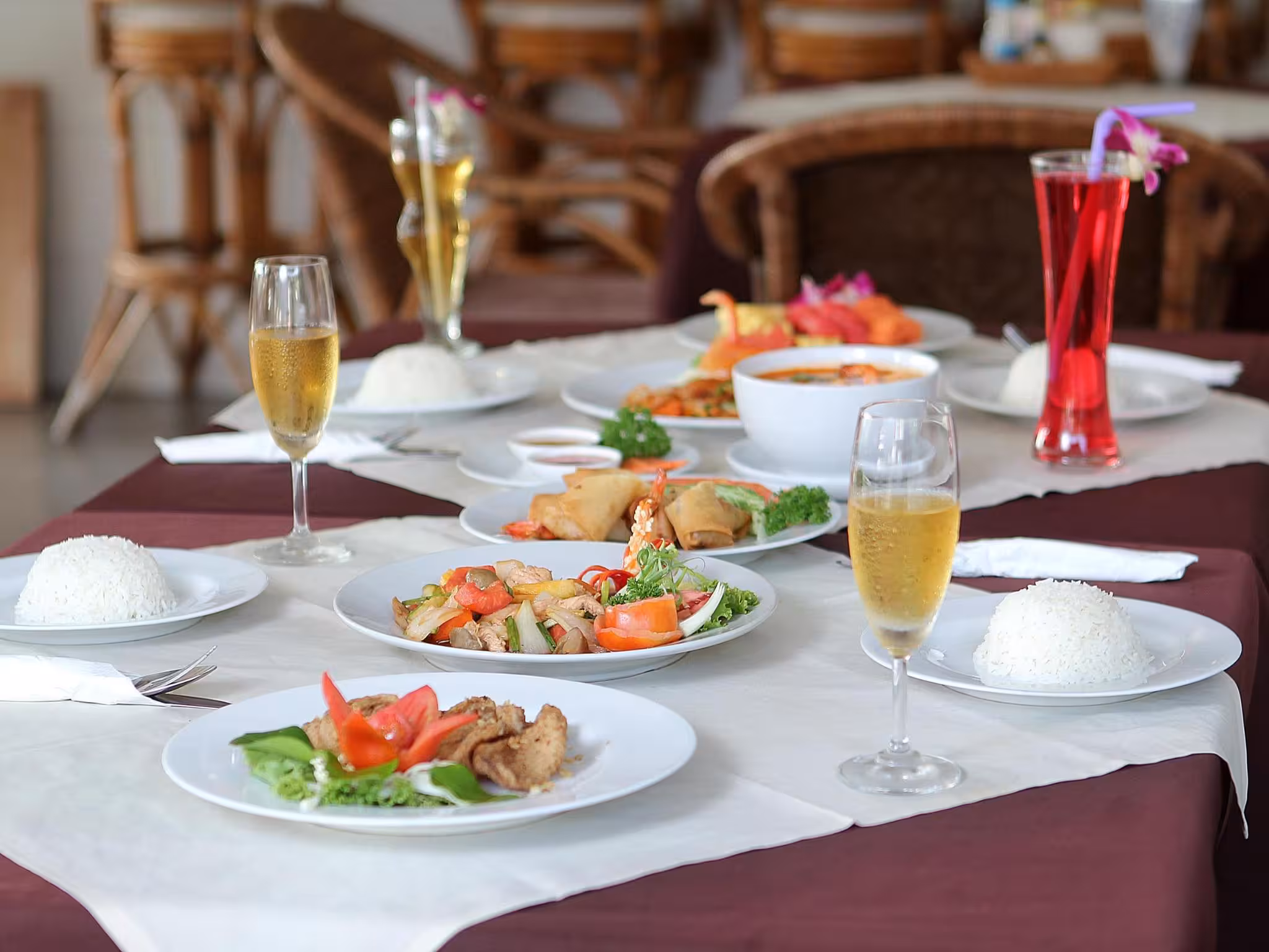 The dining area includes a restaurant and a bar. Breakfast and lunch are served every day. Special meals, including diet meals, are also available. The hotel also offers special catering options.