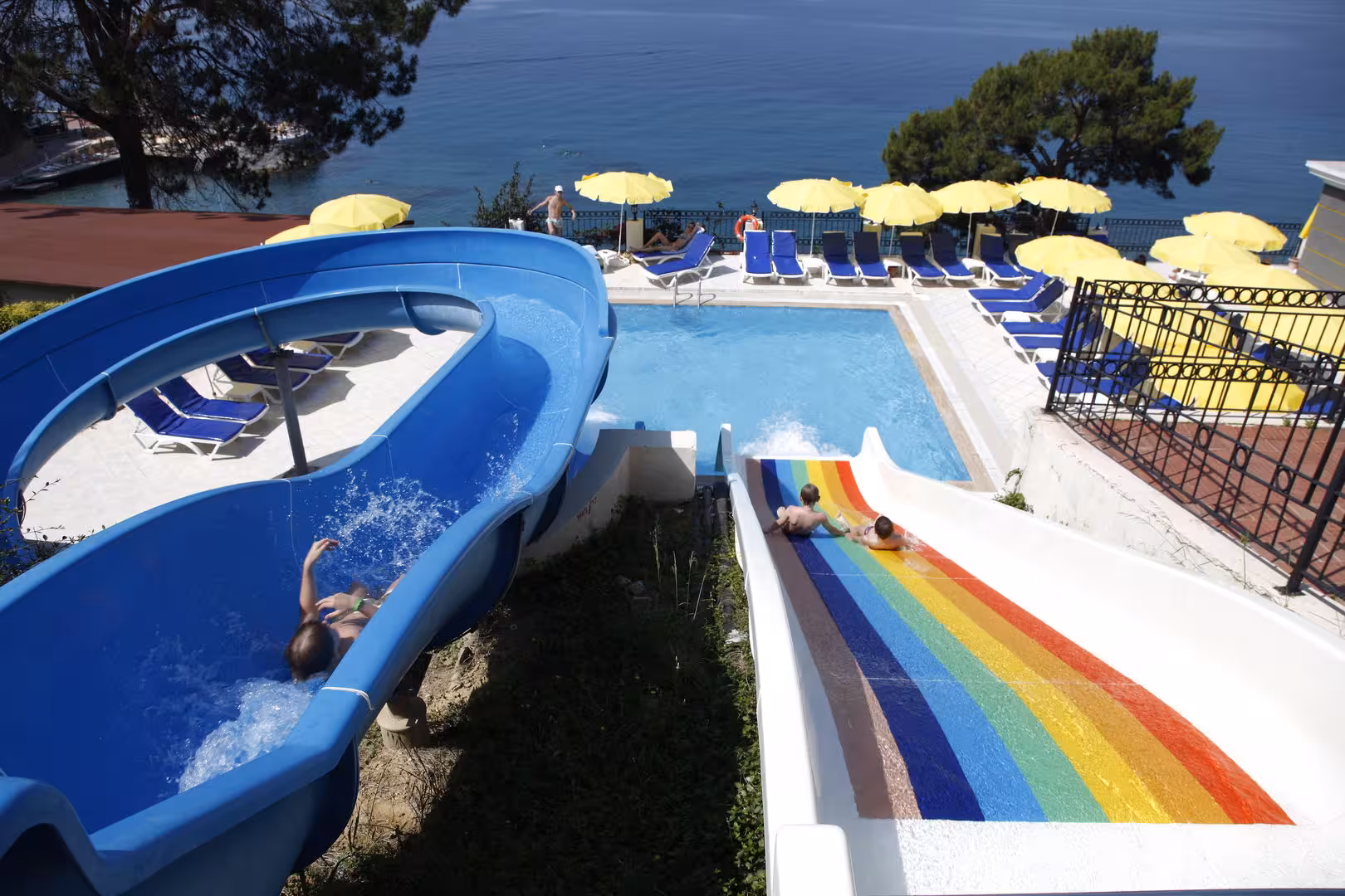 Plenty of active recreation awaits guests in the pool area's 2 outdoorpools. No matter the weather, swimming is always a possible in the indoor pool. There is also a special swimming area just for kids. Thrills on the waterslide, refreshing drinks at the pool bar and a soothing soak in the hot tub – the pool area has a little something for every state of mind and body. A short break or an entire afternoon on the sun terrace, which features sun loungers and parasols, is time well spent. For guests who wish to keep active, tennis, beach volleyball and basketball are available. Sport and leisure facilities at the resort include a gym, table tennis and darts. There is a wellness area with a sauna and a hammam and, for an additional fee, a spa and massage treatments. Leisure facilities include an entertainment programme, a kids' club, a kids' disco and a dance club.