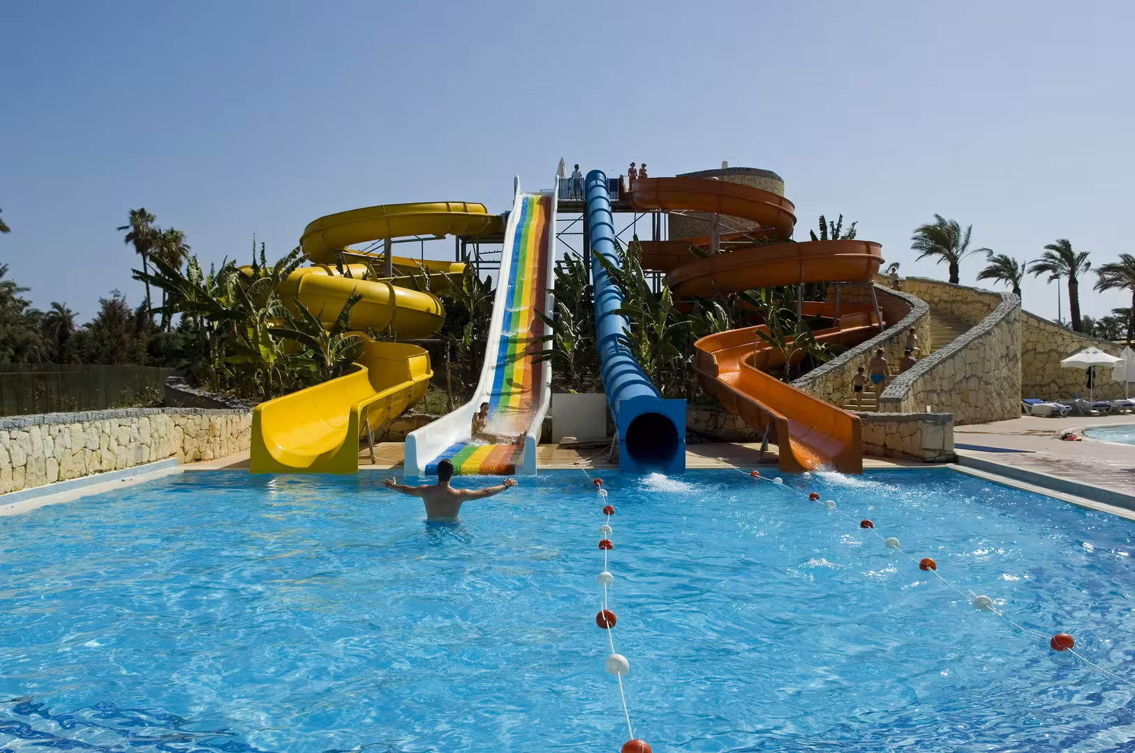 The spacious pool area, which includes 2 outdoorpools, is a great place for guests to relax and take a refreshing dip. Even on cool days, swimming is always at option at the indoor pool. Kids can splash around in one of the 2 children's pools. Pure relaxation in the hot tub, fun on the waterslide and refreshing drinks at the pool bar – guests will experience just how rich and varied a day in the water can be. A sun terrace, sun loungers, and parasols are available. The complex offers a wide range of outdoor sports, including cycling/mountain biking, tennis, bocce, beach volleyball, volleyball, basketball, crazy golf and archery. For a fee, guests can also enjoy horse riding. Guests can take part in a comprehensive water sports programme, which includes water skiing, paddle boating, canoeing, catamaraning, water aerobics and aquafit, with jet skiing, banana boat rides, snorkelling and diving available for a fee. Sports enthusiasts are also offered a wide range of indoor activities, including a gym, table tennis, badminton, billiards, darts, squash, yoga, callisthenics and aerobics. There is a wellness area with a spa, a sauna, a steam bath, a hammam, a beauty salon, anti-ageing treatments and a solarium. Subject to charge: massage treatments. Leisure facilities include an entertainment programme, a kids' club, a kids' disco, live music, a dance club and a nightclub.