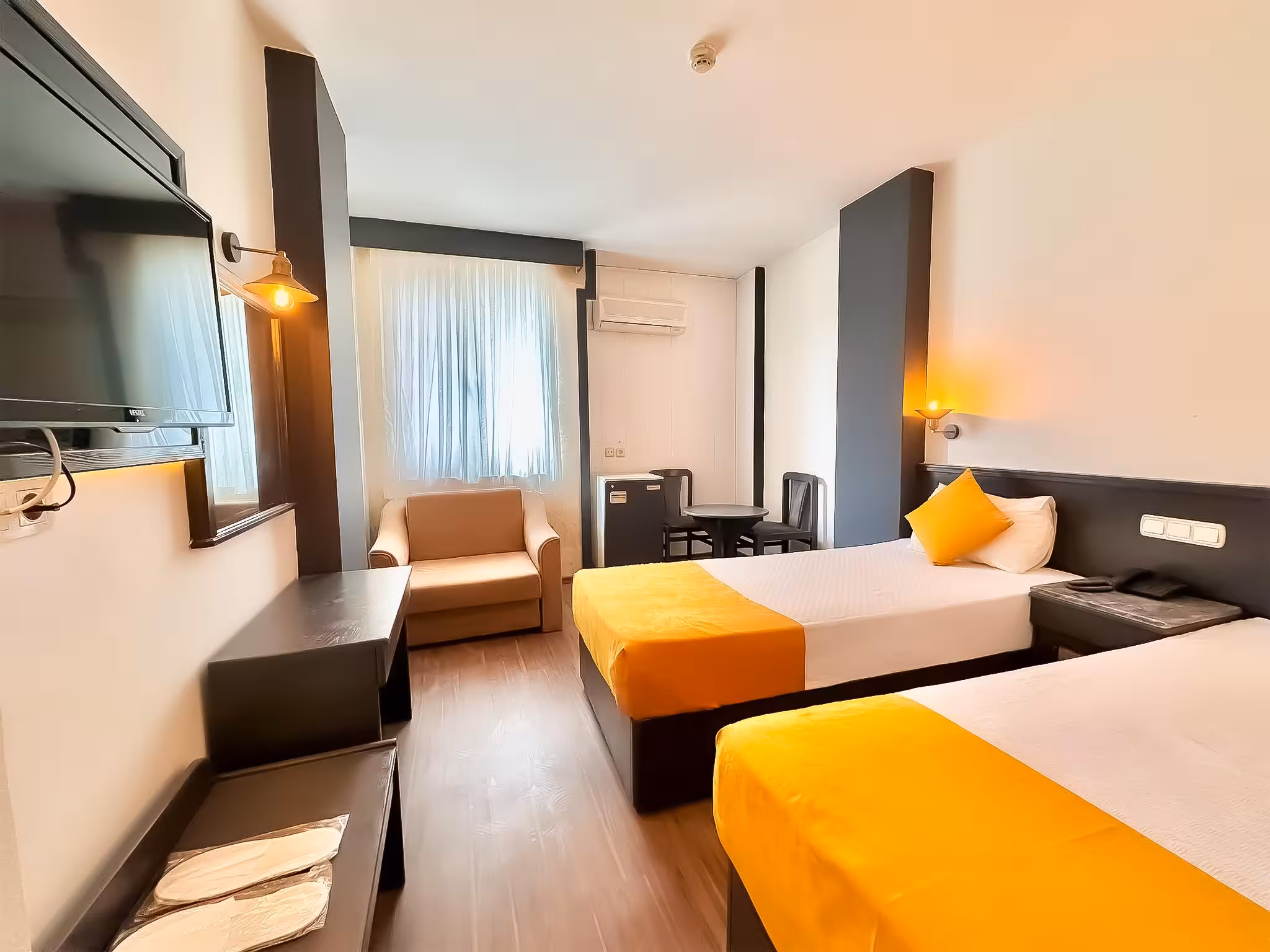 Air conditioning and central heating ensure that rooms maintain comfortable temperatures. Rooms have a double bed or a queen-size bed. Extra beds can be requested. A safe, a minibar and a desk are also available. A telephone, a TV, an alarm clock and WiFi (no extra charge) provide all the essentials for a comfortable holiday. Guests will also find slippers in their rooms. Bathrooms are equipped with a shower and include a hairdryer. As a special feature, bathrooms are also stocked with cosmetic products and a selection of towels. The hotel has family rooms and non-smoking rooms.
