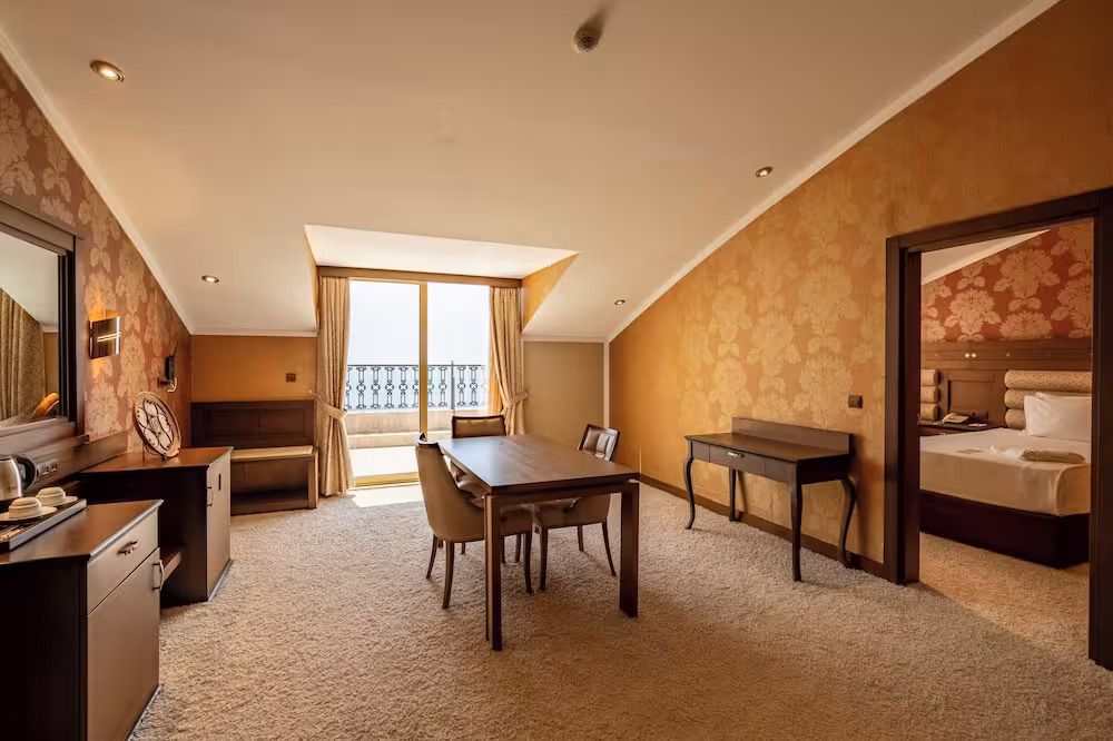Air conditioning and adjustable central heating ensure that rooms maintain comfortable temperatures. Guests can relax and enjoy the sea views from the balcony or private terrace of some rooms. All rooms are carpeted and have a double bed, a king-size bed or a sofa bed. Children's beds can be requested for younger guests. A safe, a minibar and a desk are also available. Additional features include a mini fridge and a tea/coffee station. An ironing set is provided for guests' convenience. A direct dial telephone, a TV and WiFi (no extra charge) are provided as well. Slippers are included. Bathrooms are equipped with a shower and a bathtub. A hairdryer, a vanity mirror, bathrobes and a telephone are provided. Cosmetic products and background music provide additional comfort in the bathrooms. Guests can also book wheelchair-friendly rooms with wheelchair-accessible bathrooms. The hotel has family rooms and non-smoking rooms.