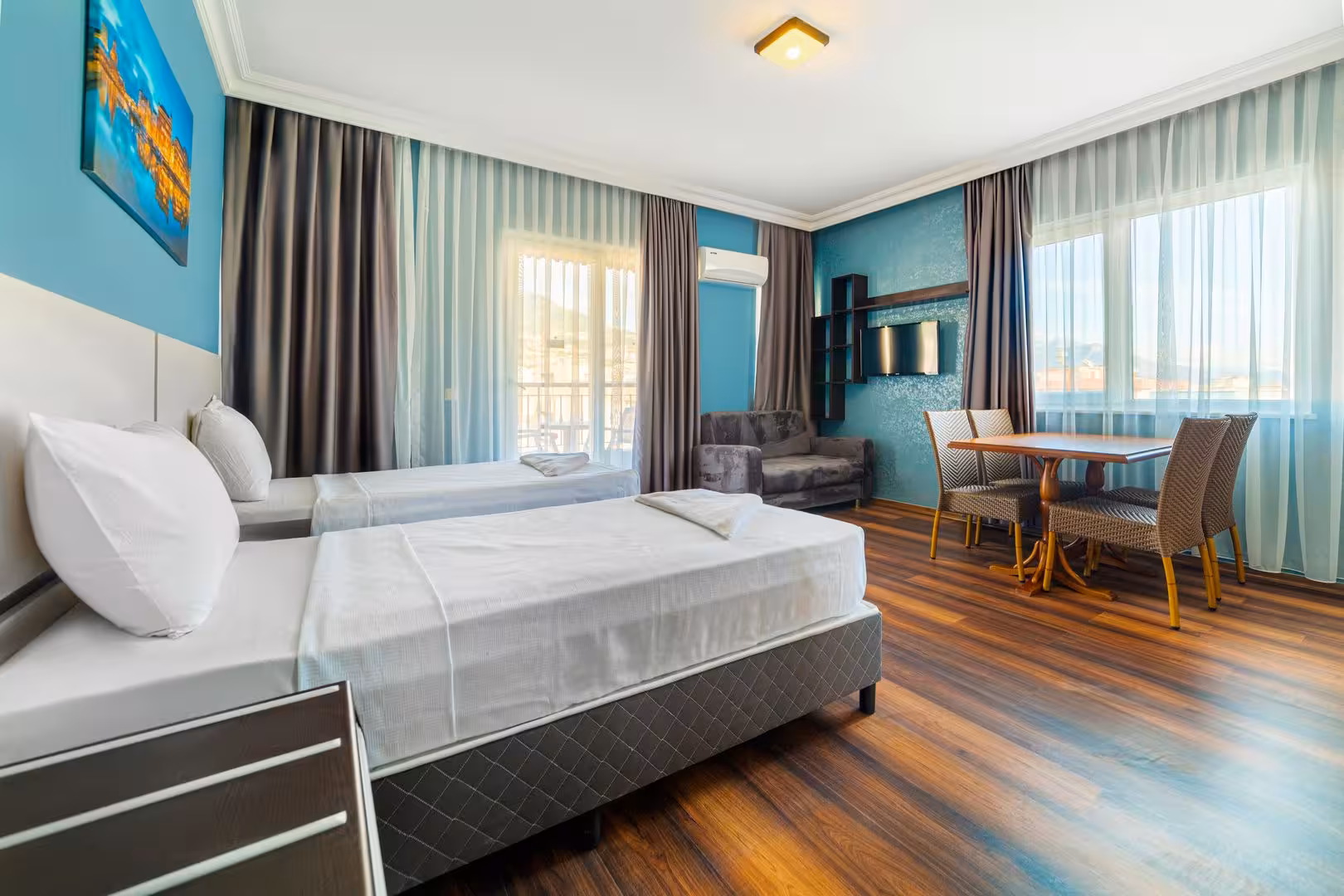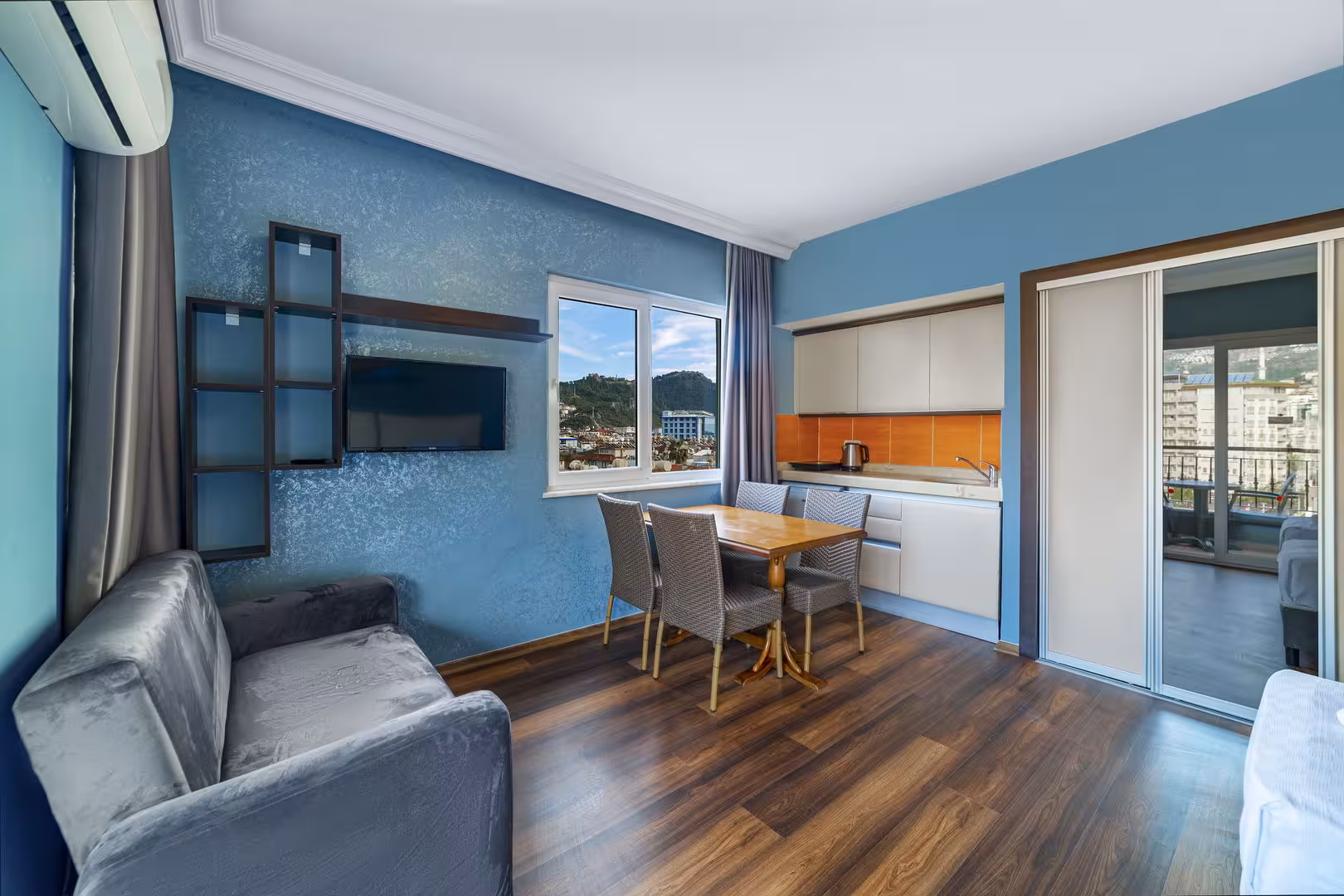 Rooms feature a living room and a bathroom. Air conditioning (for a fee) ensures comfortable temperatures. Guests can enjoy the mountain view from a balcony or terrace. Rooms include a queen-size bed. Separate bedrooms are available. Extra beds can be requested. There is also a minibar and a desk or, for an additional fee, a safe. The kitchenette comes with a refrigerator, a stovetop and a tea/coffee station. A trouser press is provided for guests' convenience. A telephone, satellite television and WiFi (no extra charge) are provided as well. A hairdryer is provided in the bathrooms. The hotel has family rooms and 36 non-smoking rooms.