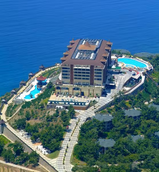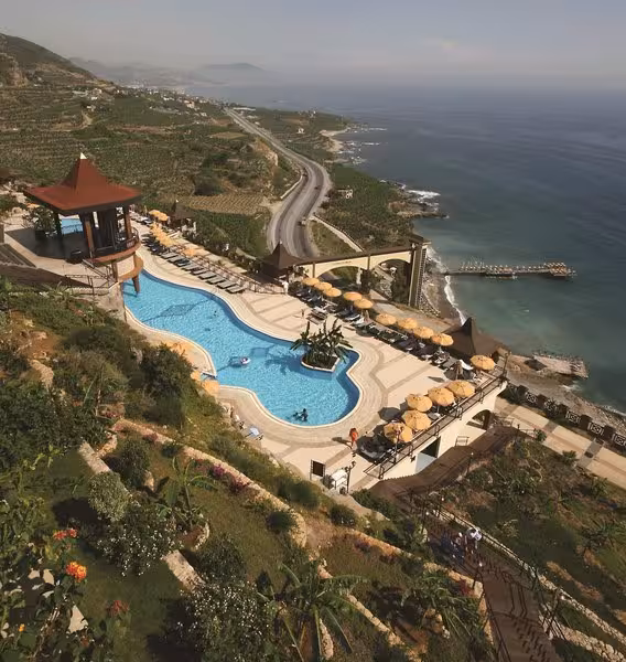 The large complex is located in the Kargicak area, just 5 km from the ancient city of Syedra and 15 km east of the popular resort of Alanya. Local amenities can be found in Mahmutlar, which is approximately 5 km from the hotel, and taxis are available at the hotel entrance. Gazipaşa Airport is about 21 km away and Antalya Airport is some 155 km away.