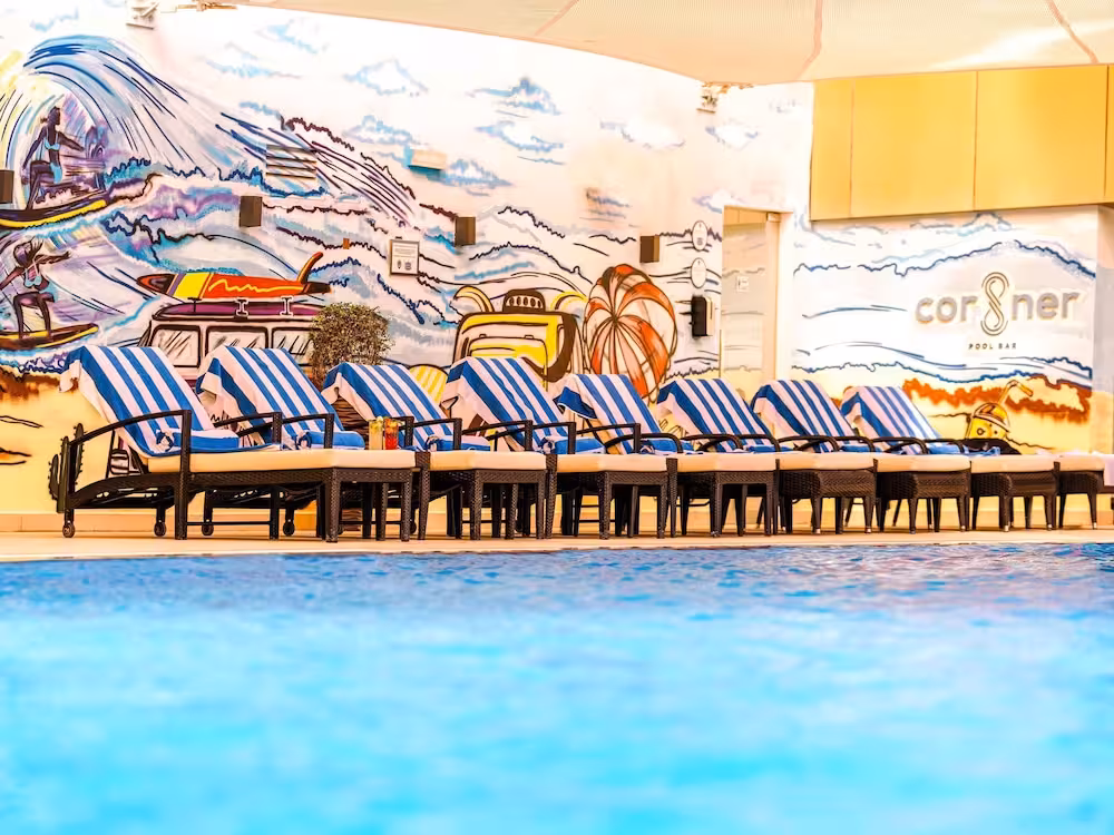 There are indoor and outdoor pools and a children's swimming area. Guests can treat themselves to refreshing drinks at the poolside snack bar and a relaxing soak in the hot tub. Comfortable sun loungers are available on the terrace. For those who wish to stay active while on holiday, the hotel offers golf. The hotel's location is particularly ideal for skiers. Sports enthusiasts are also offered a wide range of indoor activities, including a gym, billiards, darts and squash. Various wellness options are available at the hotel, including a spa, a sauna, a steam bath, a hammam, a beauty salon and massage treatments. Children are well looked after in the kids' club.