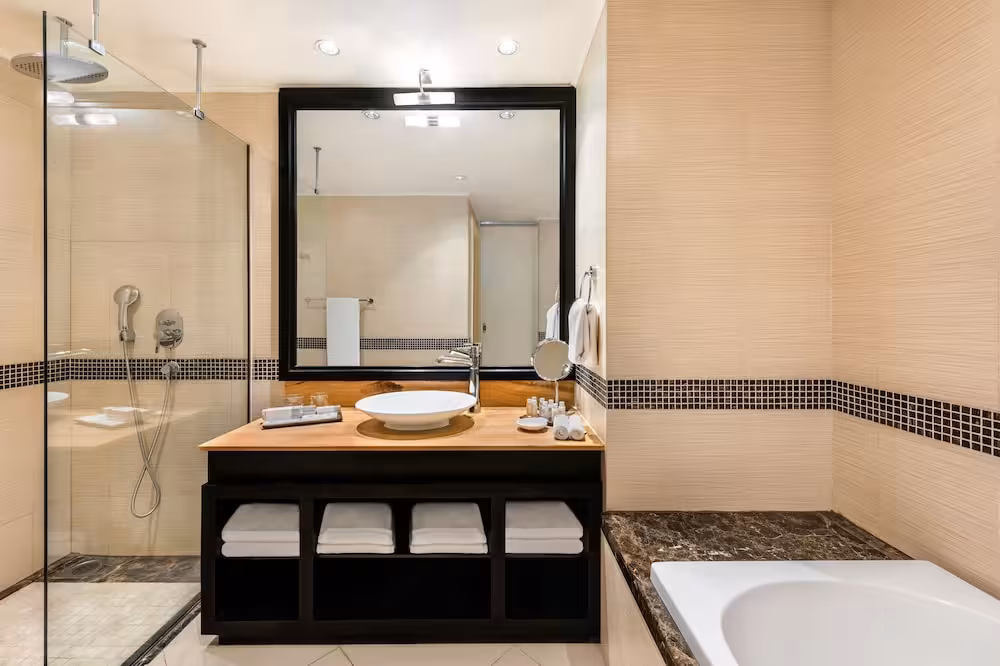 Air conditioning and central heating ensure that rooms maintain comfortable temperatures. Guests can enjoy the view of the city from a balcony or terrace. All rooms are carpeted and include a double bed and a sofa bed. Separate bedrooms are available. Children's beds and extra beds can be requested for younger guests. A safe, a minibar and a desk are also available. A refrigerator and a tea/coffee station are standard features. There is also an ironing set and a trouser press. A direct dial telephone, a television with satellite/cable channels, a radio and WiFi (no extra charge) provide all the essentials for a comfortable holiday. Slippers are included. Bathrooms are equipped with a shower and a bathtub. A hairdryer, a vanity mirror, bathrobes and a telephone are available for daily use. As a special feature, bathrooms are also stocked with cosmetic products and a selection of towels. Guests can also book wheelchair-friendly rooms with wheelchair-accessible bathrooms. The hotel has family rooms and non-smoking rooms.