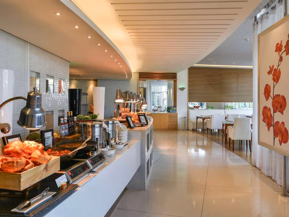 The dining area includes a restaurant with air conditioning and a bar. Breakfast and lunch offer culinary delights every day. Diet meals and children's meals can be prepared on request. The resort also offers special catering options.