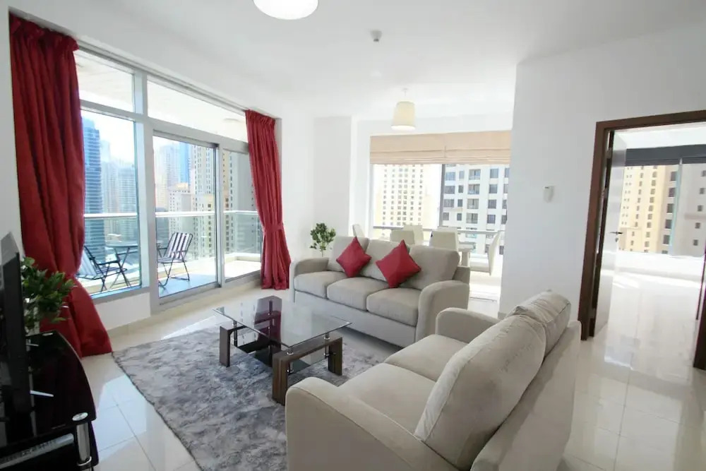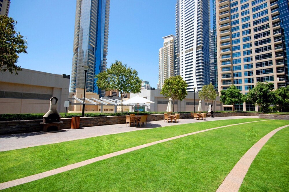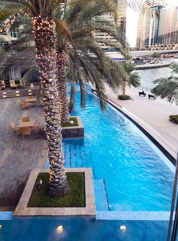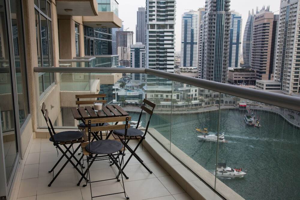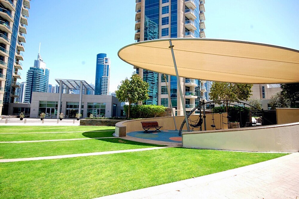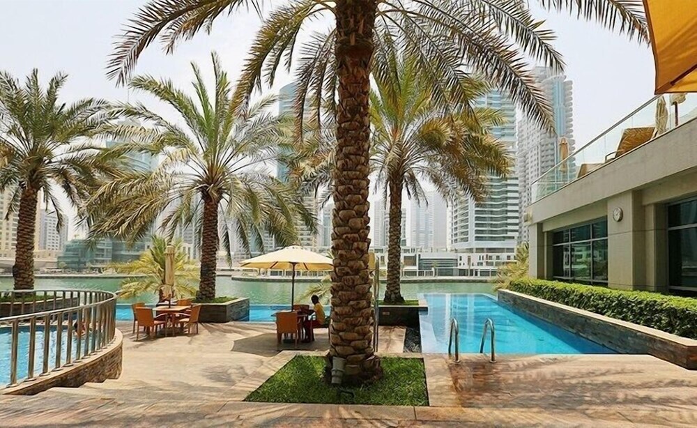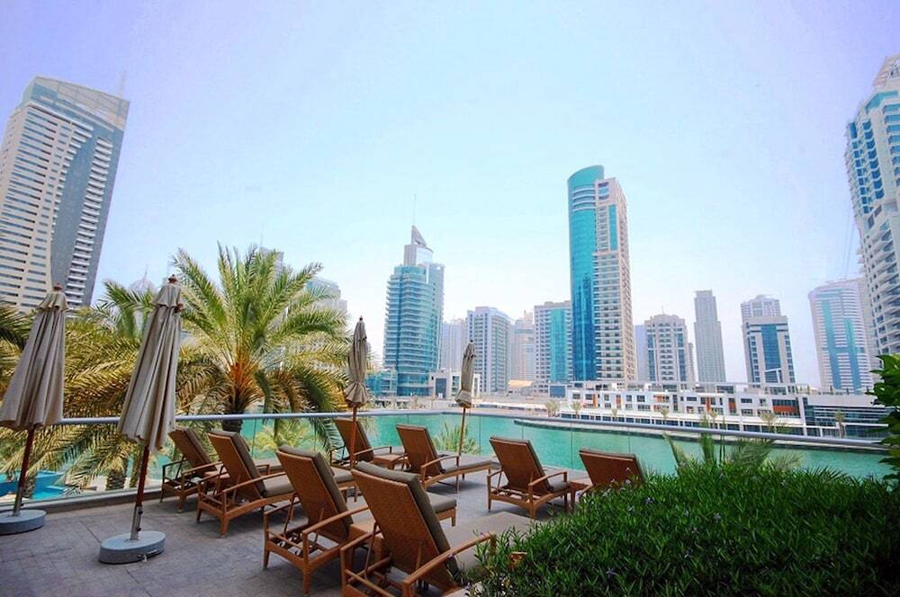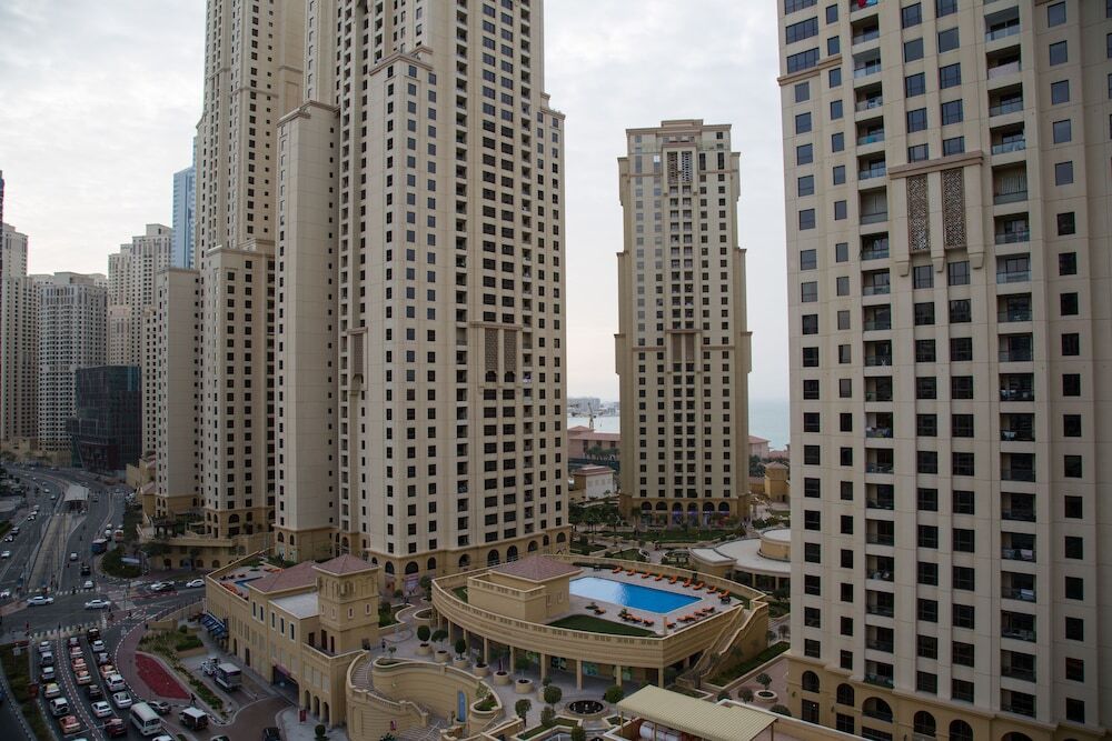 This apartment complex warmly welcomes guests in Dubai.