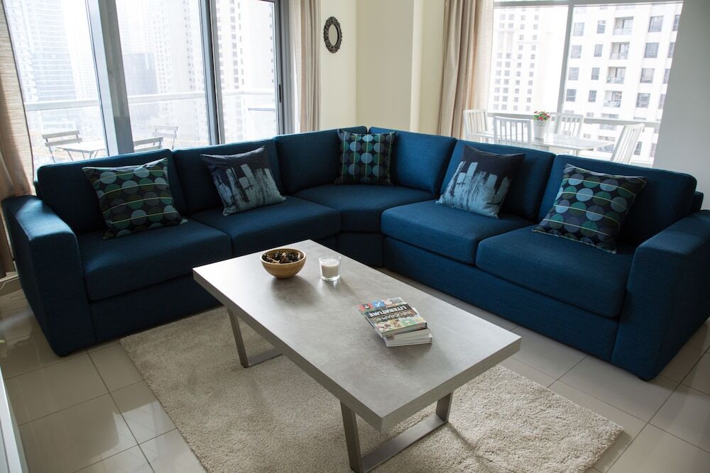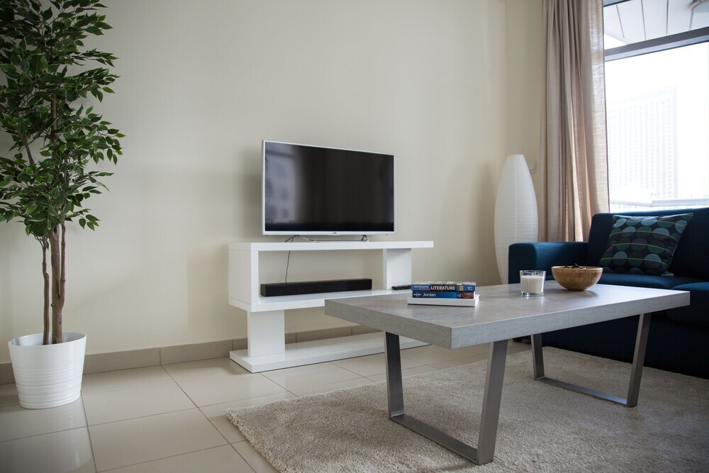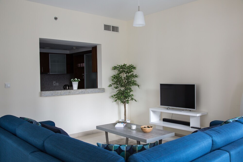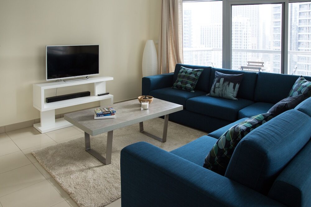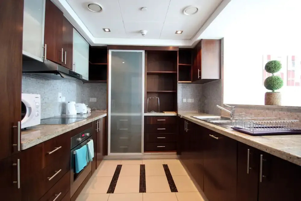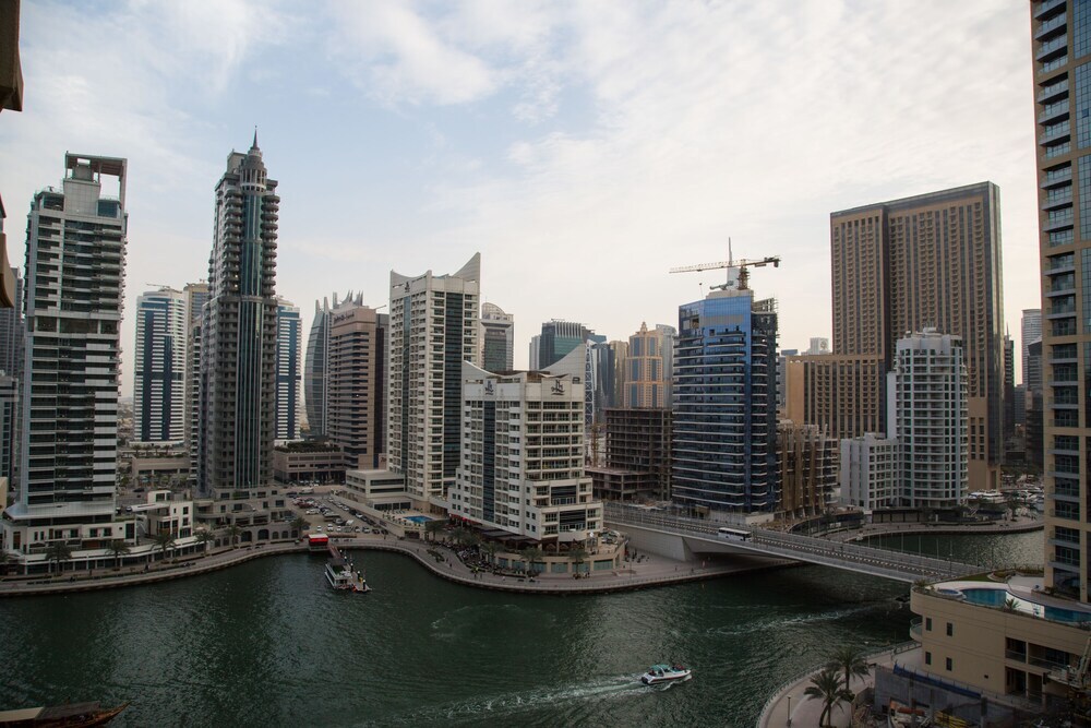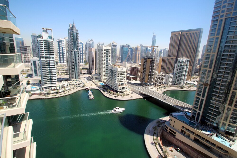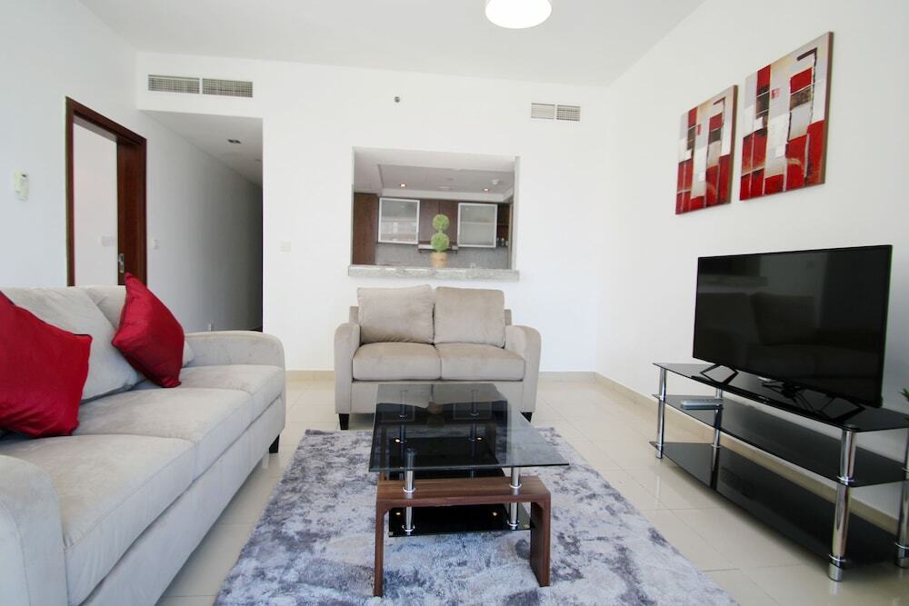 This apartment complex warmly welcomes guests in Dubai.