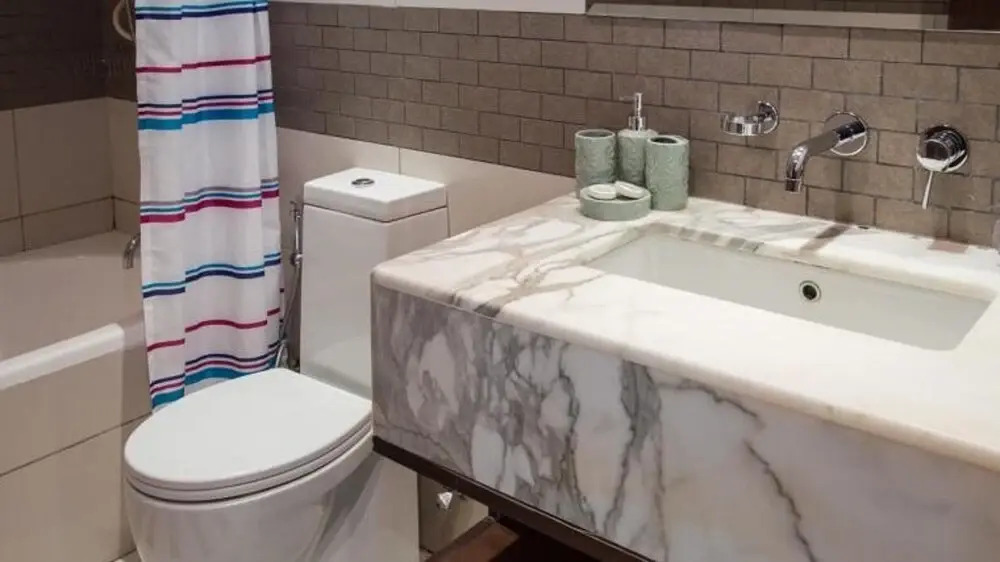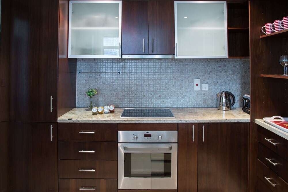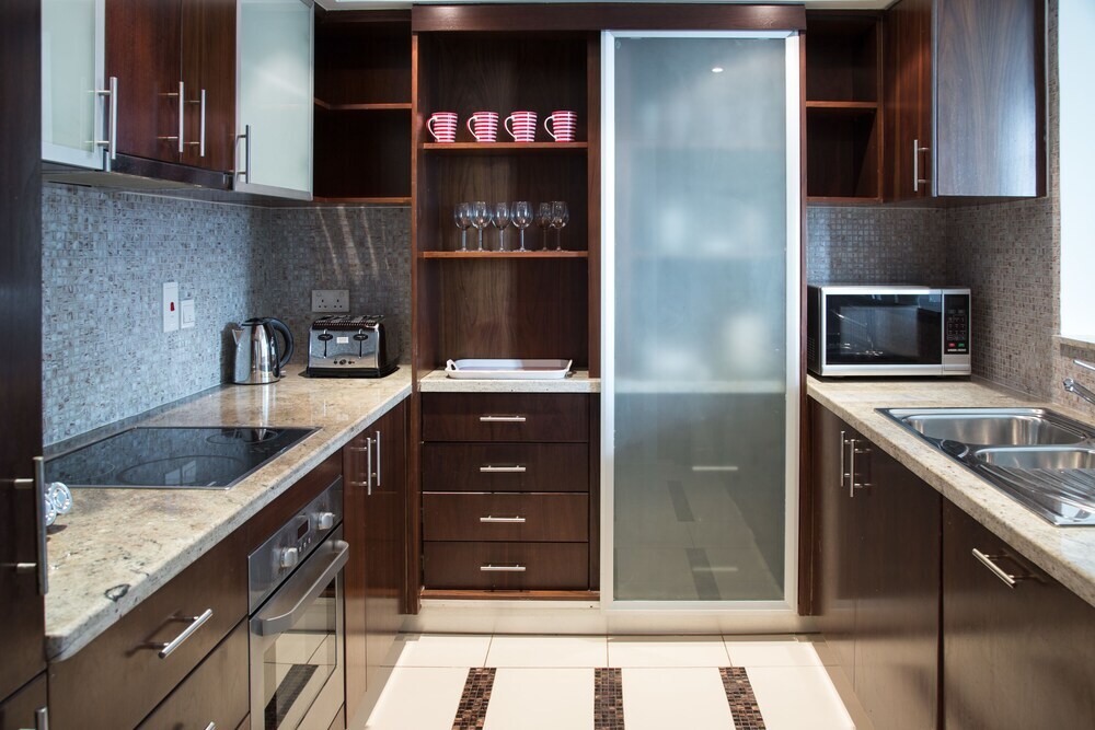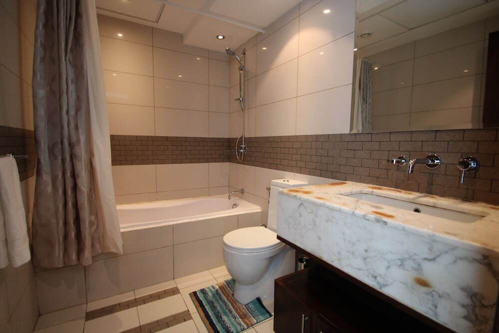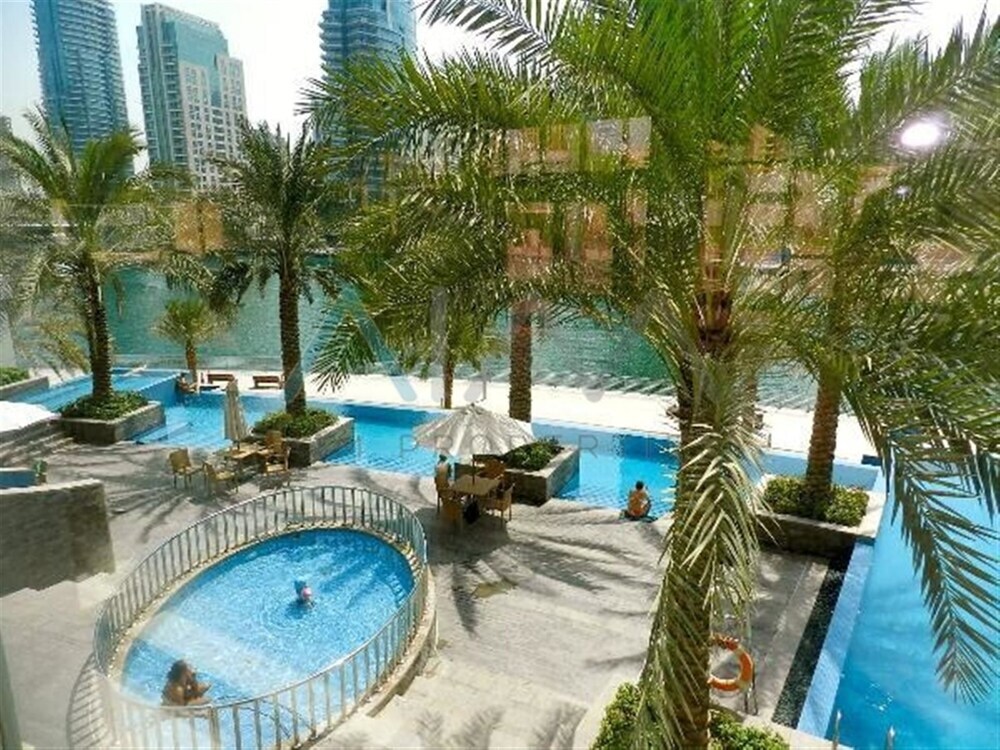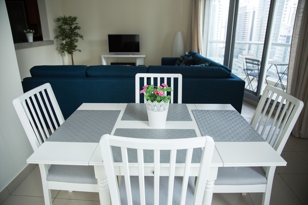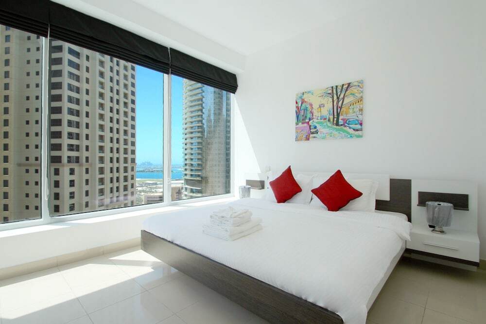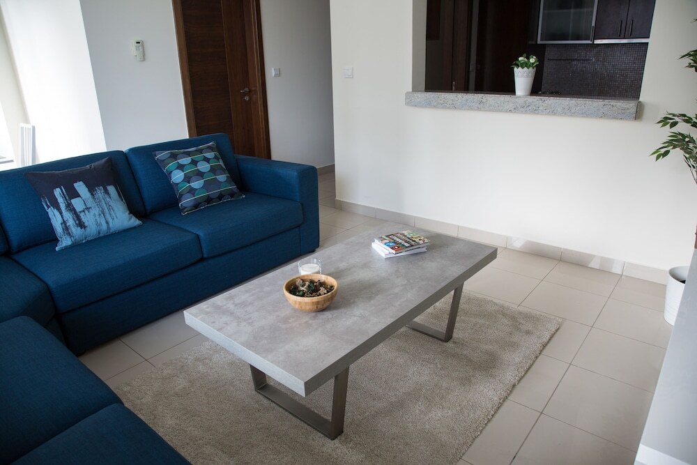 This apartment complex warmly welcomes guests in Dubai.